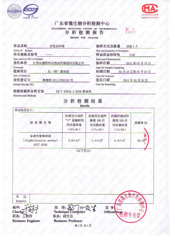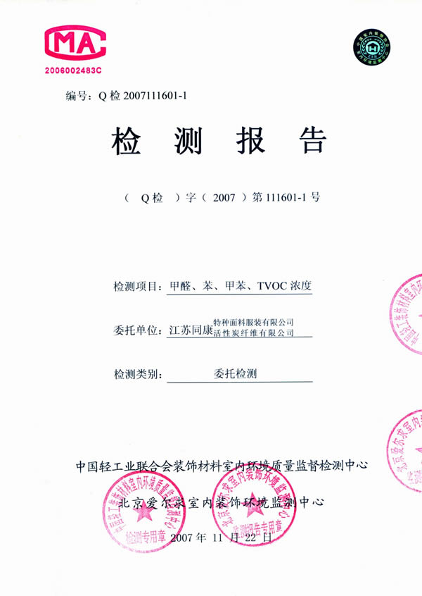 江蘇同康特種活性炭纖維公司生產(chǎn)的活性炭纖維居室凈味寶、汽車凈味寶獲得國(guó)家專利,特別適用于新裝居室、汽車或及新置家具里各種有害物質(zhì),尤其是致癌物質(zhì)、芳香族類的化合物(如苯類、醛類)的去除,使空氣潔凈清新,有利人體身心健康。該產(chǎn)品經(jīng)中國(guó)室內(nèi)裝飾協(xié)會(huì)環(huán)境監(jiān)測(cè)中心檢測(cè)對(duì)甲醛、苯、甲苯、有機(jī)揮發(fā)物(TVOC)的消除有明顯作用。